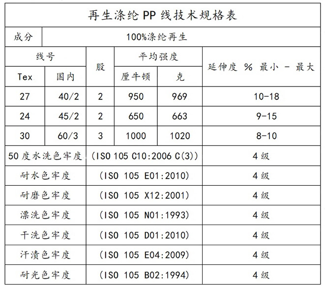 再生涤纶PP线是利用涤纶布料,废旧聚酯瓶片,纺丝废丝,泡泡料,浆块做原料,废旧瓶片经过粉碎、清洗,各种料的混合物经过干燥,熔融挤出,纺丝,卷绕,集束,牵伸,卷曲(同时根据客户的需求在卷曲的时候添加不同的油剂),松弛热定型,切断后形成不同长度的涤纶短纤。